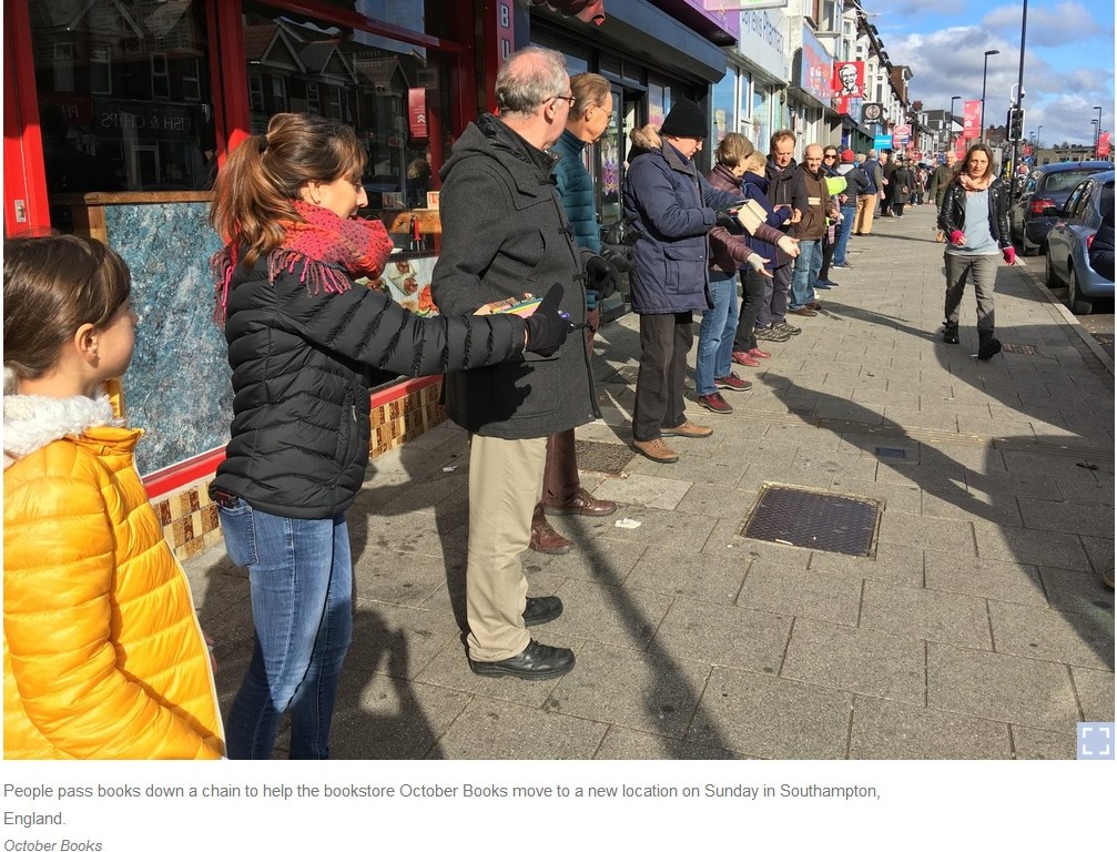 Cafes brought cups of tea to the volunteers. People at bus stops joined in. Passersby asked what was happening, then joined the chain themselves…in just one hour on Sunday, the community passed more than 2,000 books, hand to hand, to the new shop.
