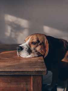 sad purebred dog sitting at table